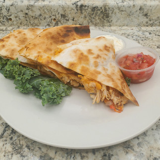 Clockwise from top left: Chicken Quesadilla, Chicken Caesar Wrap, Mac & Cheese, Salmon Patties, Meatloaf, Greek Salad Bowl